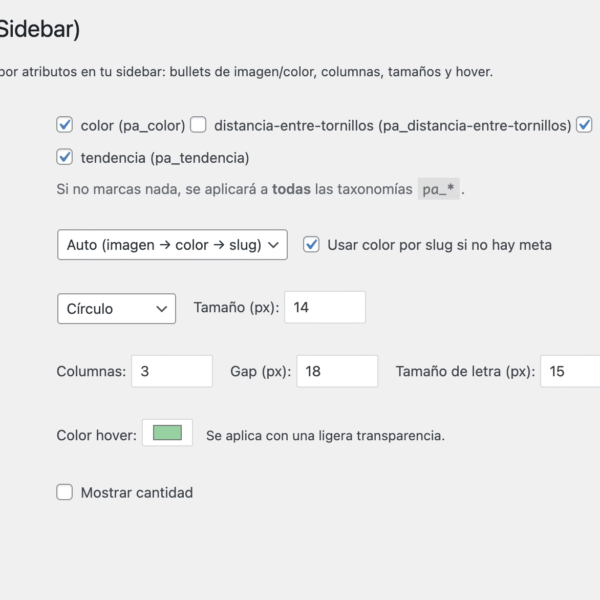 Entra en WooCommerce → Swatches Sidebar, define columnas, bullet y hover.