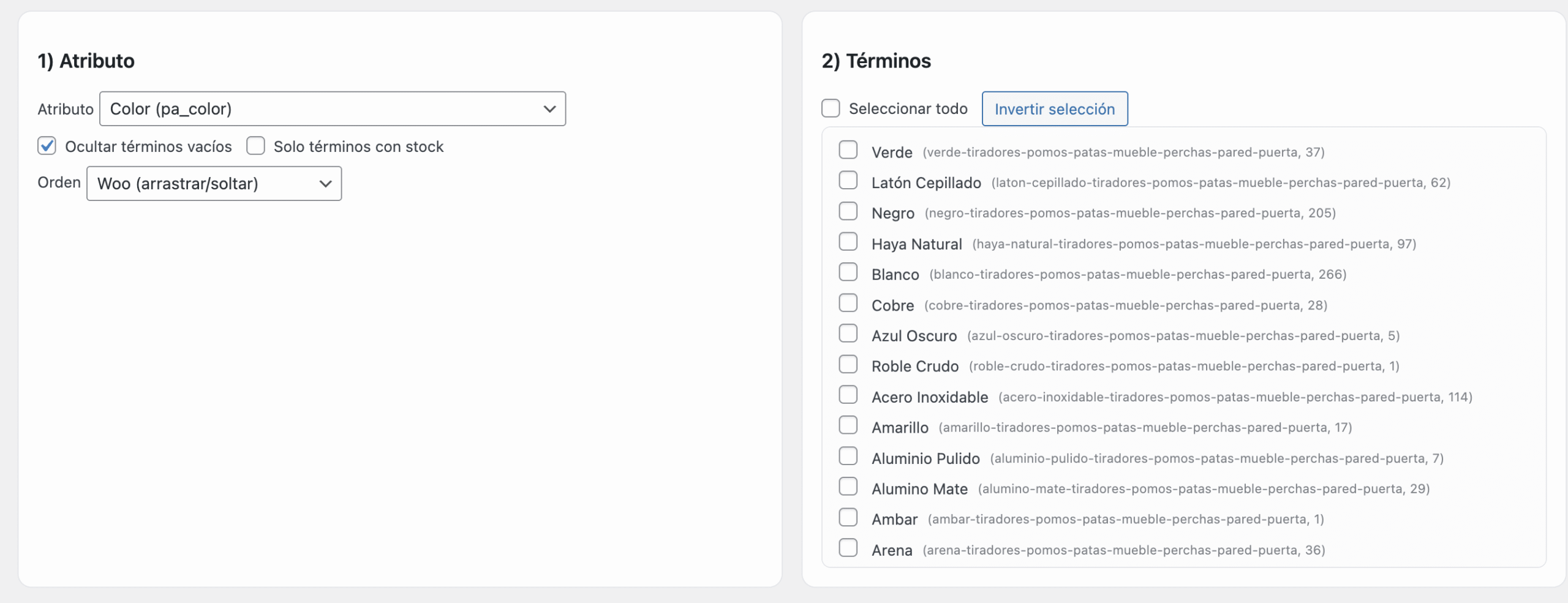 ¿Quieres crear galerías o carruseles que muestren tus términos de variables con su imagen destacada? Este es tu plugin: WC Attribute Gallery Builder, gratuito y de MARABELIA COOP.V, absolutamente compatible con variaciones de WooCommerce. Incluye una pantalla visual para elegir el atributo, marcar términos y aplicar estilos listos (grid, chips, lista o slider/carrusel), con efecto hover, orden por drag & drop y imagen por defecto cuando un término no tiene foto.